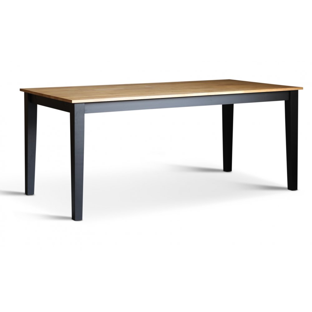 Dalsland matgrupp med stort och bra matbord med toppskiva i oljad ek och svartlackat underrede. 6 st klassiska Dalsland pinnstolar i rödlackat massivt trä.