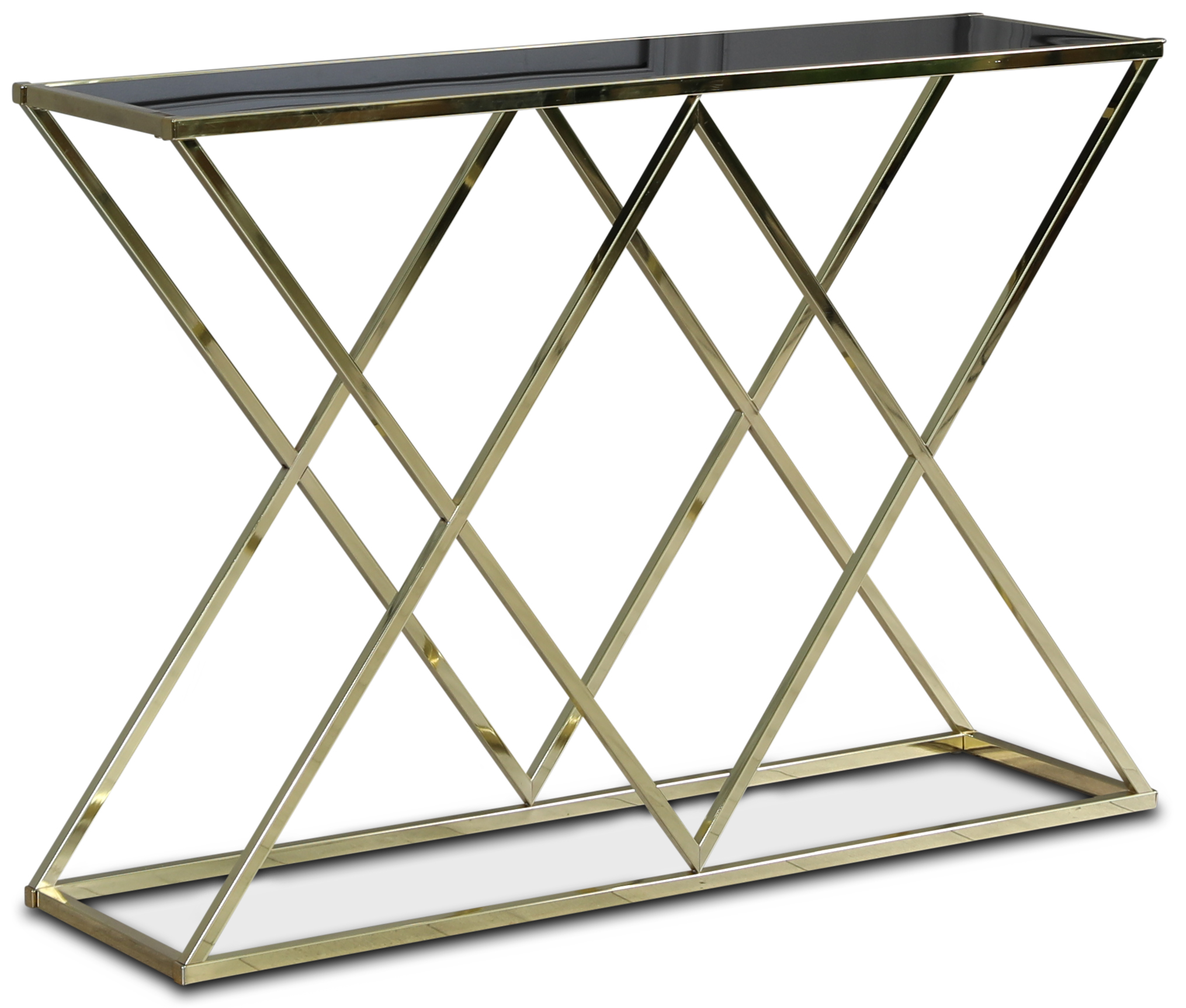Stilrent konsolbord i blank mässing med toppskiva i mörktonat glas.