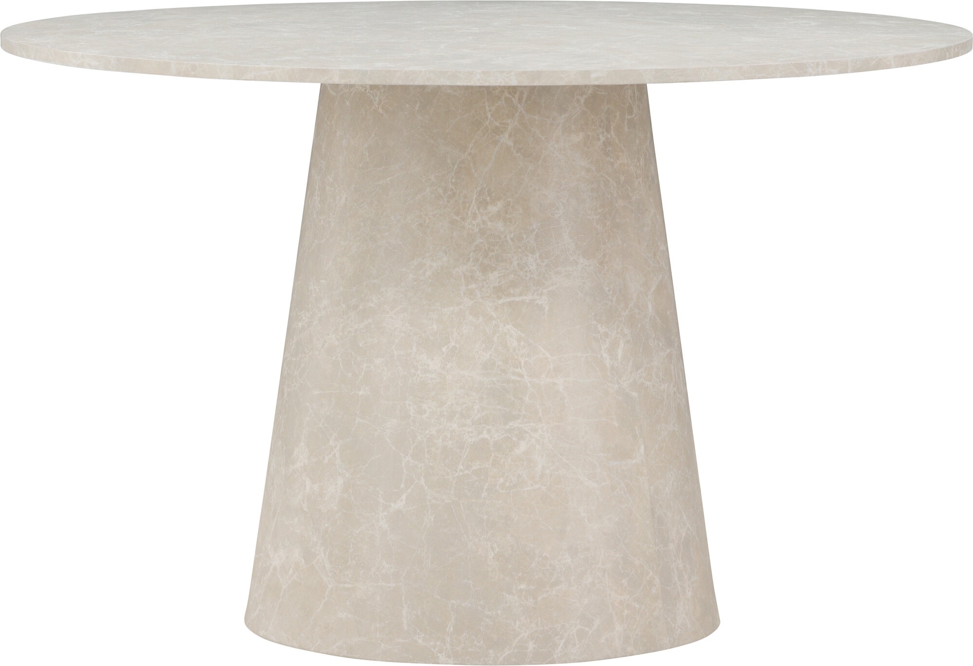 Lanzo matbord har en rund bordsskiva i marmorerad beige finish som ger känslan av natursten, men med fördelen av en lättskött och tålig yta. Bordet har en diameter på 120 cm, vilket gör det idealiskt för både vardag och fest. Den runda formen främjar gemenskap och gör att alla runt bordet sitter nära varandra. Dess tidlösa uttryck gör att det passar lika bra i moderna miljöer som i klassiska interiörer.