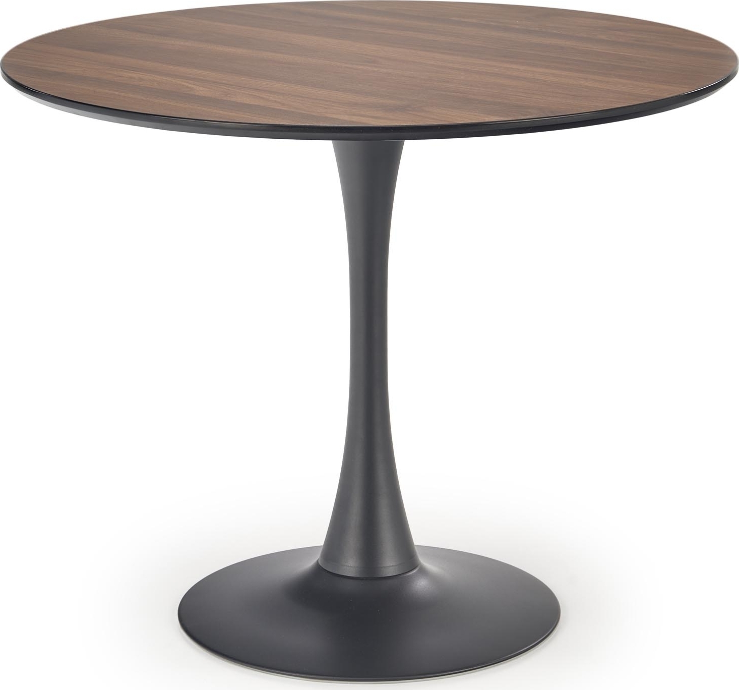 Matgruppen Olmo & Alfred kombinerar modern elegans med kompakt funktionalitet och passar perfekt i mindre matplatser eller kök. Det runda Olmo matbordet har en bordsskiva i laminerad MDF med vacker valnötsfinish och ett stabilt, svart pulverlackerat stålunderrede i pelardesign. Kombinationen av varma trätoner och svart metall ger ett tidlöst uttryck som enkelt smälter in i olika inredningsstilar.