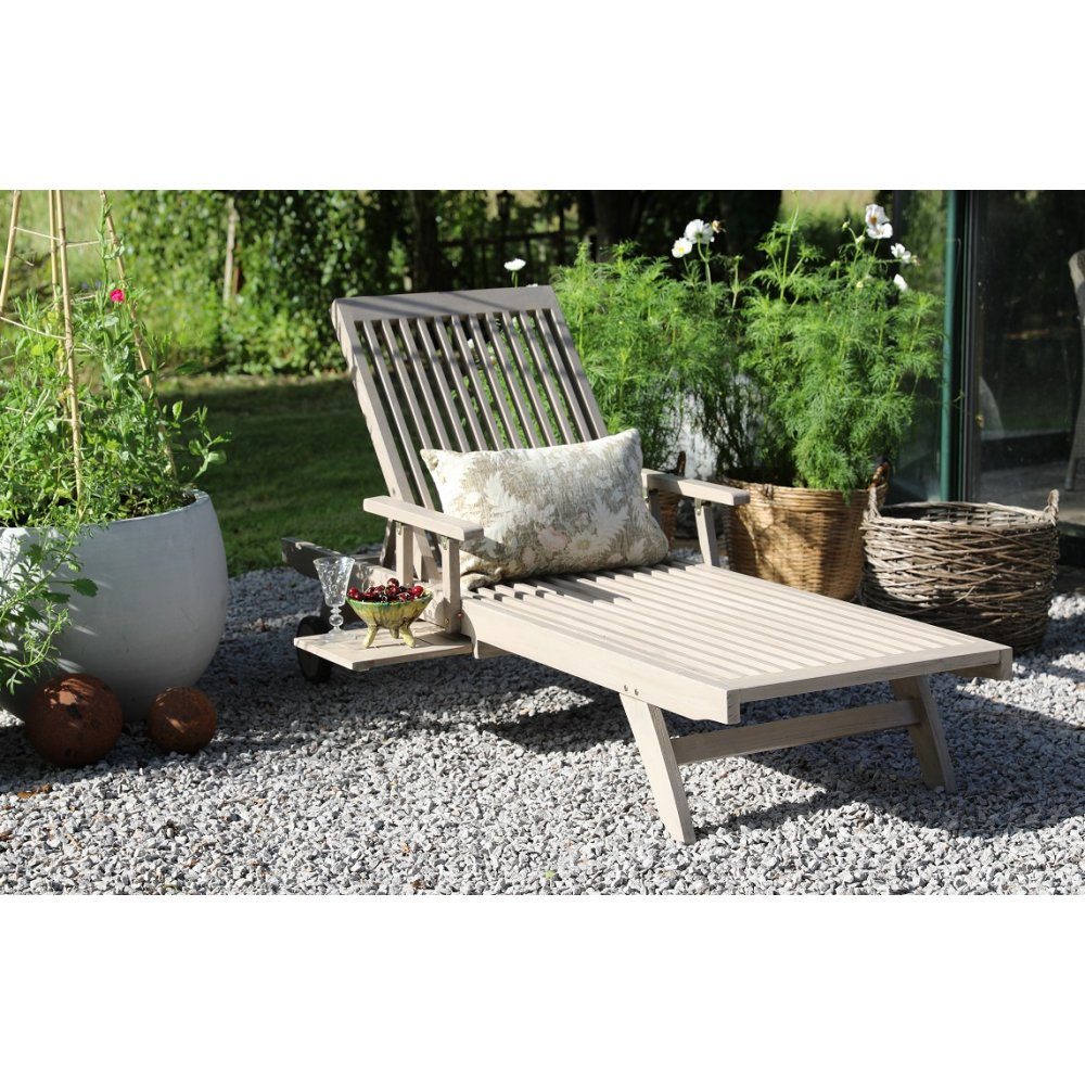 Däckstol / solstol i massiv grålackerad teak, stolen är utrustad med hjul för enkel förflyttning. Praktiskt utfällbart hyllplan för förvaring av ett glas eller mobil. Ställbar rygg i fyra olika positioner. Saltö är en klassisk serie med möbler som är tillverkade i teakträ.