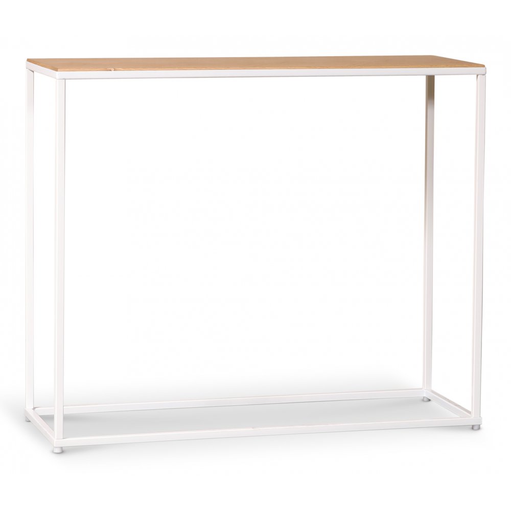 Stilrent konsolbord av vit metall med toppskiva av fiskbensmönstrad ekfanèr.
