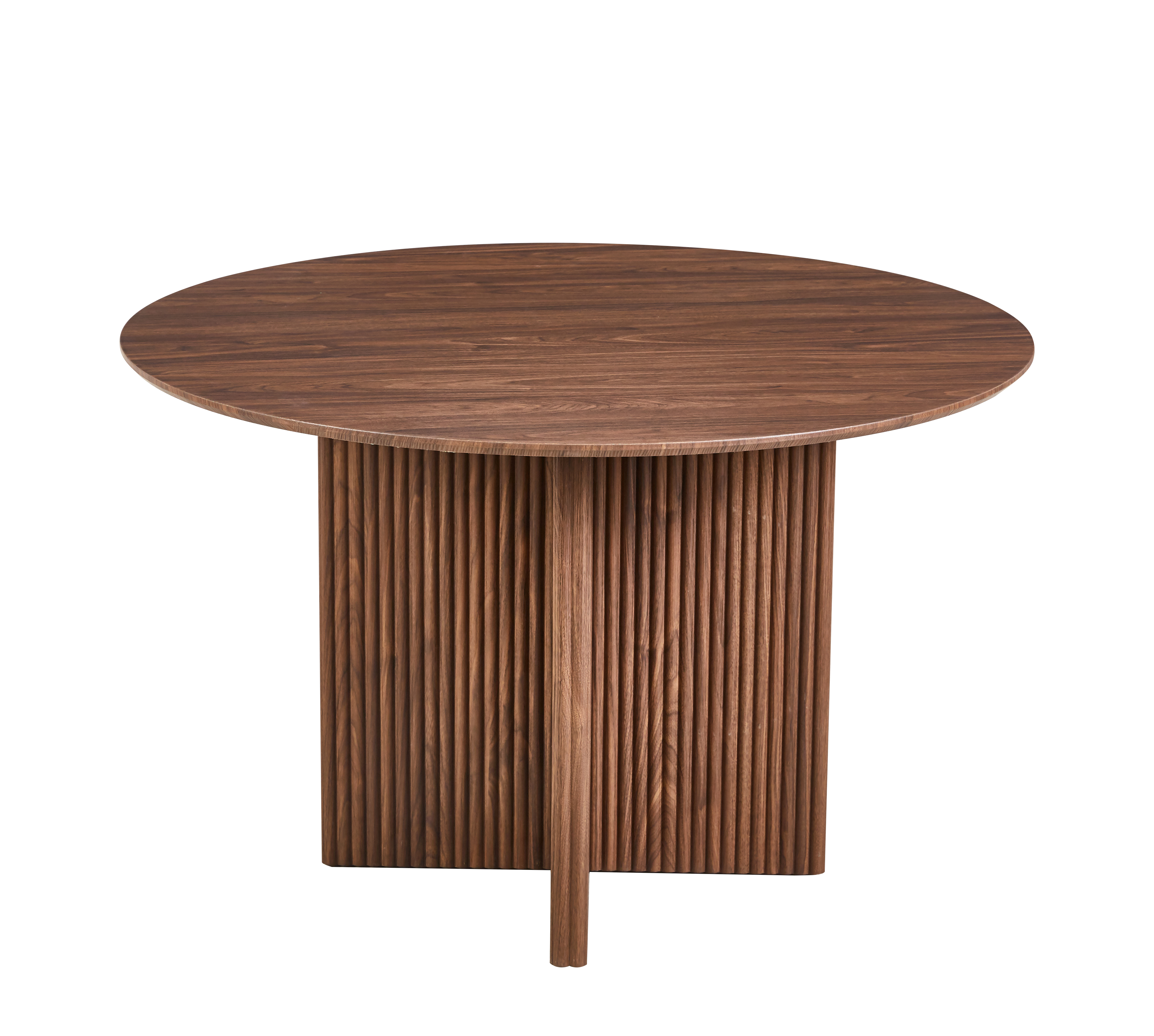 En stilren och modern matgrupp som kombinerar värmen från valnöt med den eleganta mjukheten hos ljusgrå sammet. Crossby matbord har en rund bordsskiva i valnötsfolierad MDF med dekorativa räfflade bordsben i trä, vilket ger en trendig och exklusiv känsla. Det runda formatet skapar en inbjudande samlingspunkt för familj och vänner, perfekt för både vardag och fest.