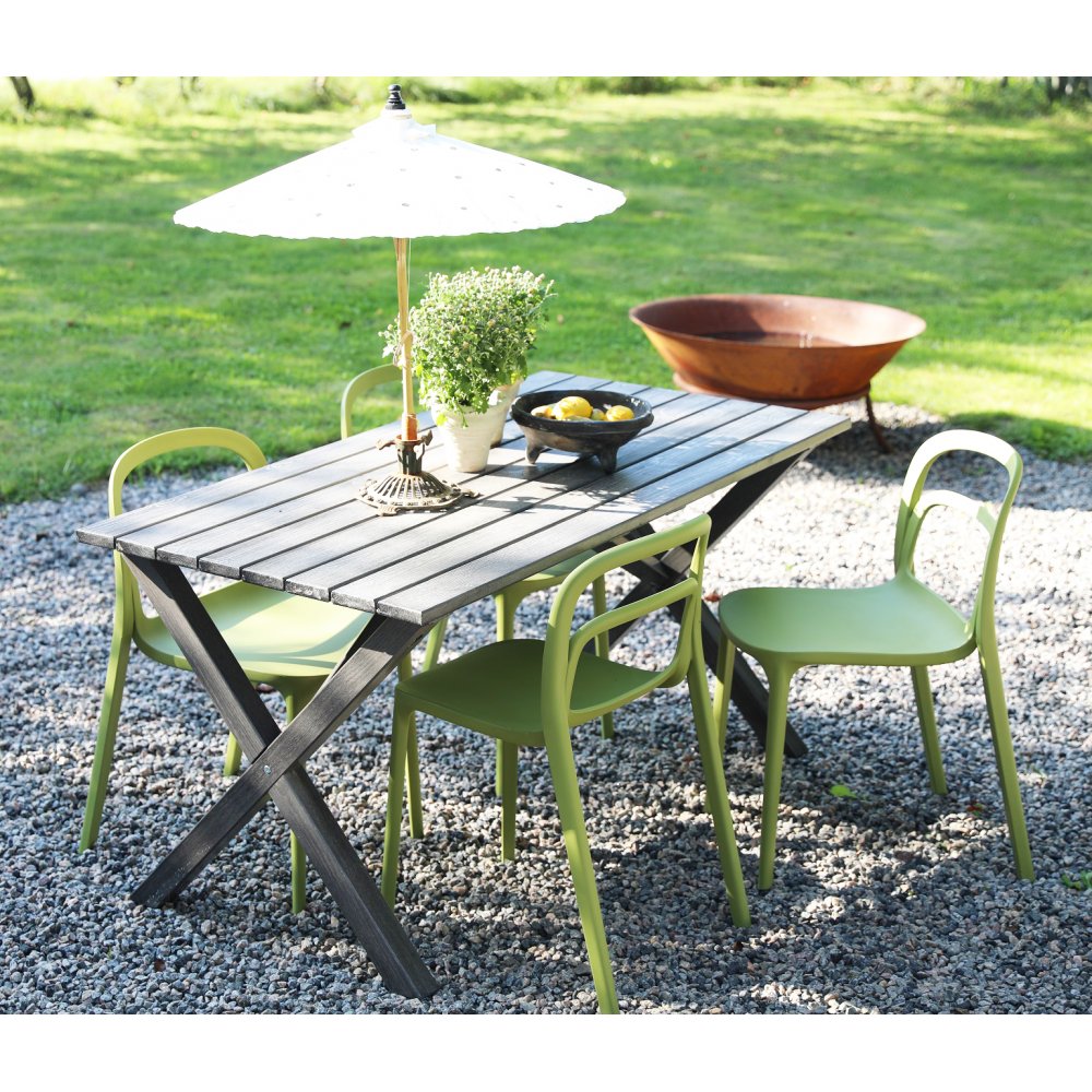 En nätt matgrupp till uteplatsen från Skånska Möbelhuset. Saltö slagbord i teak med 4 st stapelbara Nordanå stolar i grön formgjuten plast. En matgrupp i harmoni där möblerna går snyggt ihop och skapar en helhet som är svåröverträffad. Passar lika bra i uterummet som på altanen.