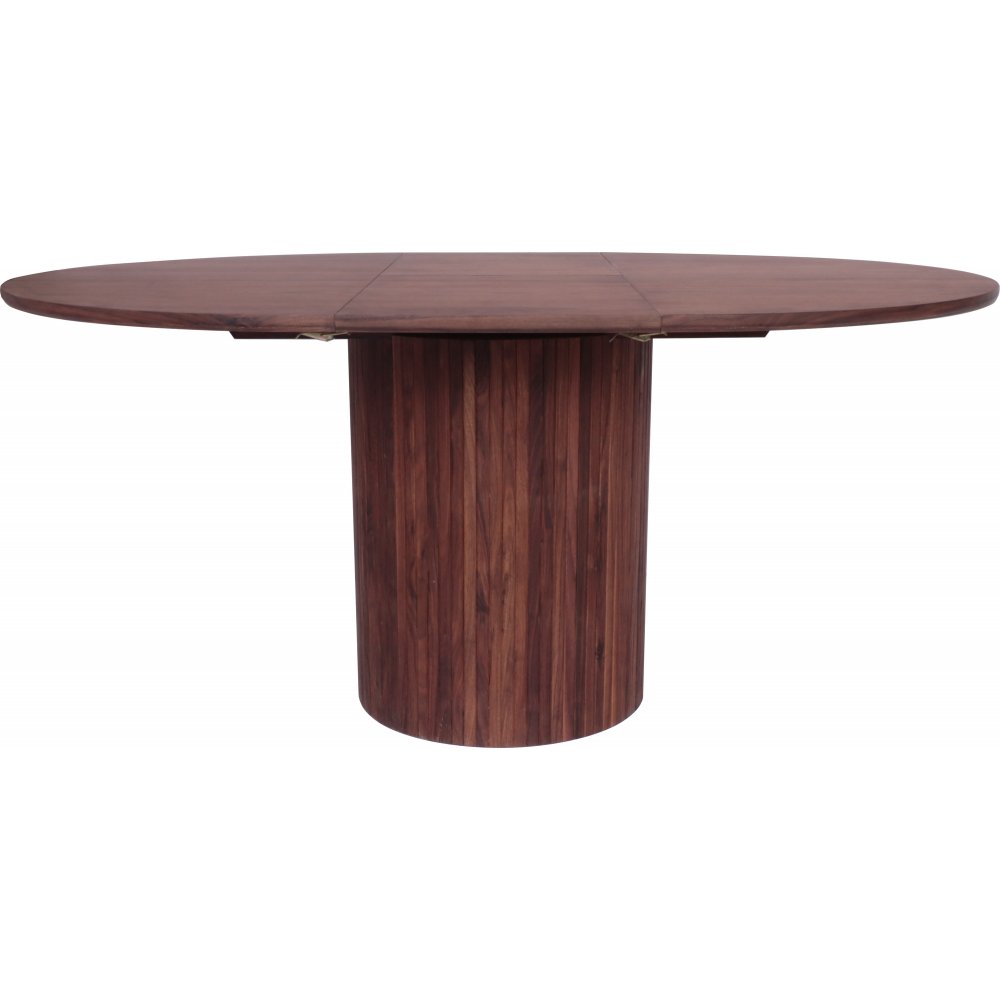 Detta runda matbord i elegant valnöt har en diameter på 115 cm och levereras med en smart, vikbar iläggsskiva som enkelt förlänger bordet till 160 cm. När iläggsskivan inte används förvaras den praktiskt i bordets mittdel. Tillverkat i en kombination av massivt trä och fanér för både hållbarhet och ett sofistikerat utseende.