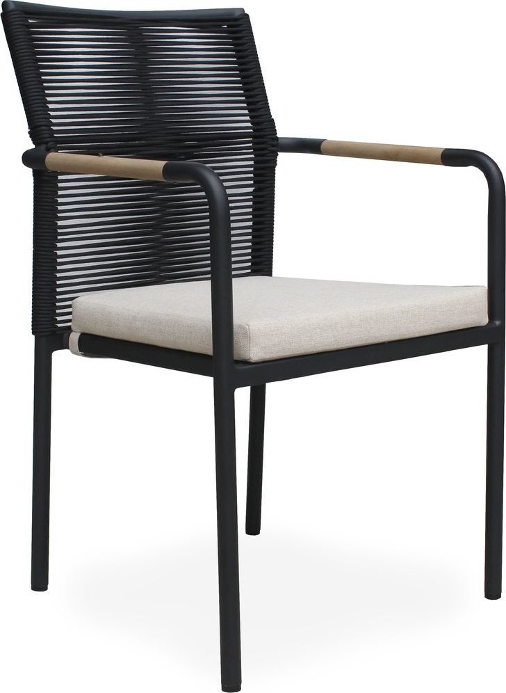 Saltö matgrupp för uteplatsen med ett rektangulärt matbord i massiv teak, tillsammans med Skanör karmstolar med beige skön sittdyna och en svartlackad aluminiumstomme. En modern kombination på uteplatsen.