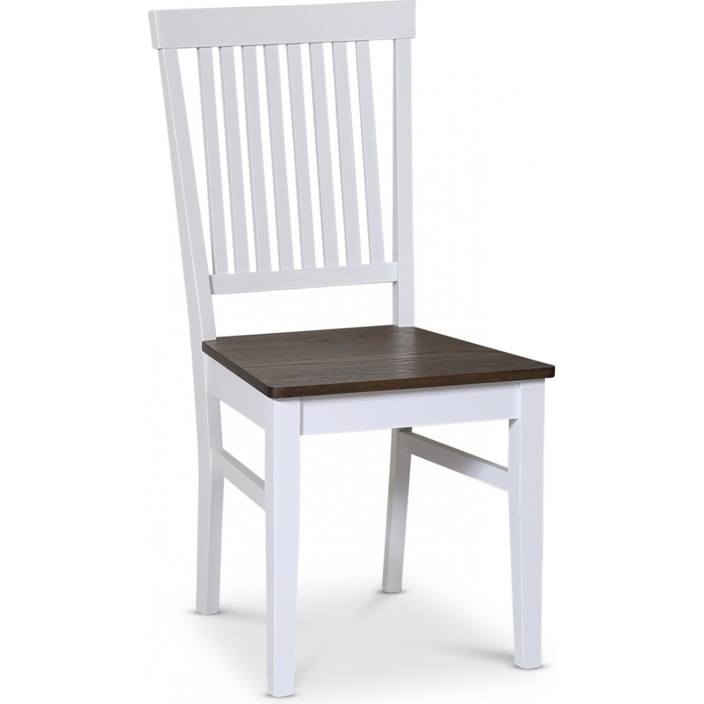Skagen matgrupp från Skånska Möbelhuset, klassiskt runt matbord Ø120 cm i diameter, med vitt underrede och en toppskiva i brunoljad ekfanèr. Det ingår 4 stycken matchande Skagen stolar i vitlackat trä med en brunoljad eksits.